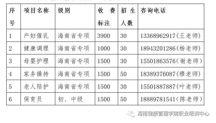 以服务民生、促进就业、加快健康服务的发展,面向全社会开办健康调理专项培训班,增加社会健康行业专业技术性人才,培养社会健康服务、康复保健、医疗保健、医疗美容等专业人才,设置理论、实践培训课程,经专项职业能力鉴定,由海南省人力资源开发局(海南省就业局)颁发海南省专项职业能力证书。